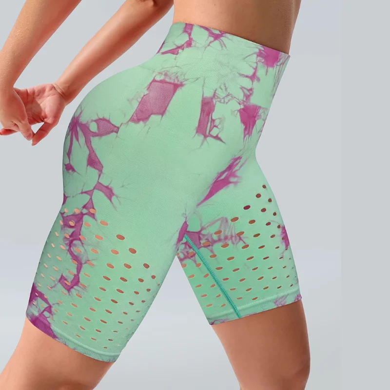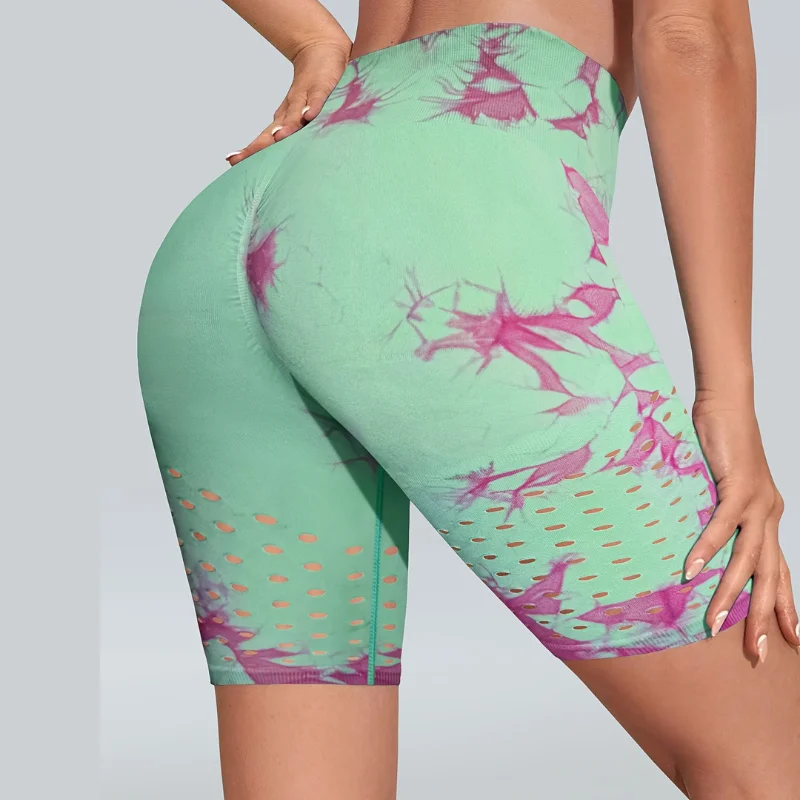 Seamless Tie Dye Hollow Out Breathable Slim Fit High Waist High Stretch Butt Lifting Yoga Sports Shorts for Women